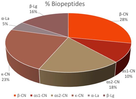 Also, the analysis results indicate that the vast majority of the biopeptides are casein-originated as 79% of the biopeptides found in Tsalafouti cheese come from caseins (28% β-CN, 23% κ-CN, 18% αs1-CN, 10% αs2-CN) and only a relatively small percentage of 21% originate from serum proteins like α-lactalbumin (5%) and β-lactoglobulin (16%) (Figure 2).