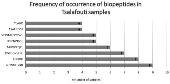 It is noteworthy that the same biopeptides appeared in several of the cheese samples (Figure 3), which may result from the local breeds of animals, from the feeding of the animals, as well as the similar production methods followed for Tsalafouti cheese. There are peptides that appear in the majority of samples, such as NPWDQVKR, KDQDK, LKGYGGVSLPE, which show antidiabetic activity, antithrombotic activity and inhibitory activity against dipeptidyl peptidase 4, respectively.
