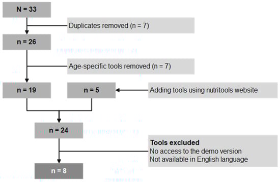 The literature search identified a total of 33 tools. After removing duplicates (n = 7) and excluding age- and target-group-specific tools, a total of 19 tools remained; these tools were supplemented by 5 tools from the Nutritools website (n = 24). Due to the restriction of the German and English languages, including availability as a full or demo version, a total of 16 tools were excluded, resulting in 8 tools being included in the evaluation (Figure 1). The 8 remaining tools were the web-based 24 h dietary recalls ASA24, myfood24, Intake24 and SACANA and the smartphone apps Nutrihand, Traqq, Keenoa and MyFitnessPal.