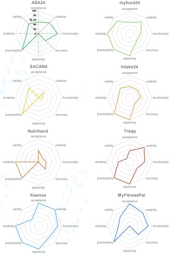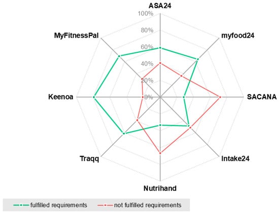 The Keenoa tool met most of the requirements (32/38; ~84%) for a digital dietary survey method (Figure 2). Similarly, Keenoa also showed the highest fulfilment rate at the level of the evaluated categories compared to the other applications (6/8; 75%; Figure 3). According to the present evaluation, Keenoa can be described as functional, user-friendly, accepted, practicable, objective, and reliable, but not as sufficiently valid and accurate. The mobile food diary MyFitnessPal also met a comparatively high proportion of the requirements (27/38; ~71%; Figure 2) and evaluation criteria (5/8; 62.5%; Figure 3). Compared to Keenoa, there was a difference in reliability that was not present in MyFitnessPal. The digital 24 h recall myfood24 (24/38; ~63%), Traqq (24/38; ~63%) and ASA24 (23/38; ~61%) were close behind in terms of the accomplished requirements. Overall, ASA24 showed the greatest discrepancy between the requirements and the criteria fulfilled, as only the functional and user-friendly criteria could be considered satisfied (2/8; 25%). The other tools, i.e., Intake24 (18/38; ~47%), Nutrihand (13/38; ~34%) and SACANA (11/38; ~29%), all met less than 50% of the requirements. Figure 3 provides an overview of the individual tools and the percentage of achievements for each category.