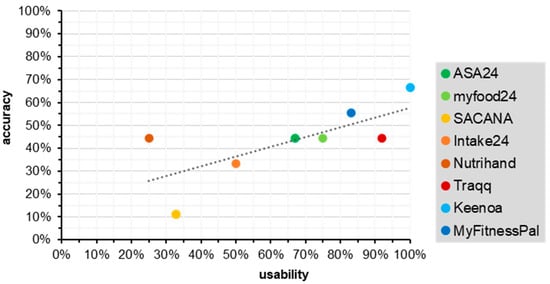 ASA24, myfood24, SACANA, Intake24, Traqq, Keenoa and MyFitnessPal scored higher in the usability category than in the accuracy category. The Nutrihand tool was more accurate but less user-friendly. None of the analyzed tools had both high accuracy and high usability. Overall, there was a positive correlation (r = 0.72; r2 = 0.51) between the accuracy and usability categories (Figure 4).