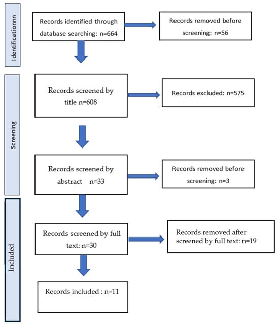 The search identified a total of 664 articles. After they were screened by title and abstract, 56 abstracts were excluded because the original article was not in English, and more than 575 were removed because they lacked relevance (Figure 1). A total of 33 articles were retrieved and assessed for eligibility from the MEDLINE database. Three of them were removed because we could not permit the full text, and out of the 30 remaining, 11 were excluded after reading the full text because they were irrelevant to the topic of the search.