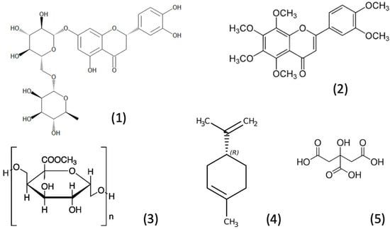 Structures of five representative bioactive components in lemons. (1) Eriocitrin (Formula: C27H32O15, CAS Number: 13463-28-0), a flavanone; (2) Nobiletin (Formula: C21H22O8, CAS Number: 478-01-3), a PMF; (3) Pectin, also known as pectic polysaccharides (Formula: C6H10O7, CAS Number: 9000-69-5), the major dietary fiber present in lemon peel; (4) d-Limonene (Formula: C10H16, CAS Number: 5989-27-5), the major component (45–75%) of the essential oils from lemon; and (5) Citric acid (Formula: C6H8O7, CAS Number: 77-92-9), the most abundant organic acid in lemon, representing as much as 8% in dry weight.