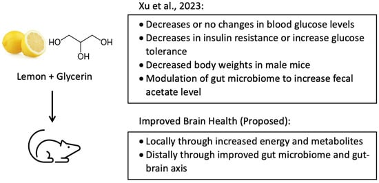Beneficial effects in combining lemon and glycerin. As demonstrated by Xu et al., 2023 [14], the combined treatment may in part reduce the side effects of individual treatments (e.g., hyperglycemia, increased insulin resistance or decreased glucose tolerance). Furthermore, it may have some additional benefits, e.g., weight loss. Microbiome modulation likely contributed to the observed beneficial effects, at least in part, by increasing fecal acetate level. Such combination may improve the neurological well-being using mechanisms both locally and distally.