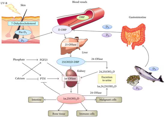 The majority of vitamin D is transported though the body via vitamin D binding protein (DBP), one of the serum albumin binding proteins []. DBP is formed in the liver and found in the liver, kidneys, heart, lungs, intestine, and bones. Both vitamin D2 and vitamin D3 are referred to as vitamin D. Vitamin D2, or ergocalciferol, is formed when a plant sterol is exposed to ultraviolet light [,], and it differs from cholecalciferol (vitamin D3) by the presence of a methyl group at C24 and a double bond between C22 and C23 [,]. Mushrooms exposed to UV light are high in vitamin D2 []. Both vitamins D3 and D2 are absorbed equally from the intestine; however, most supplementation studies of D3 and D2 show that 25(OH)D concentrations were greater with D3 as compared to D2 []. The metabolism of D2 and D3 is illustrated in Figure 2.