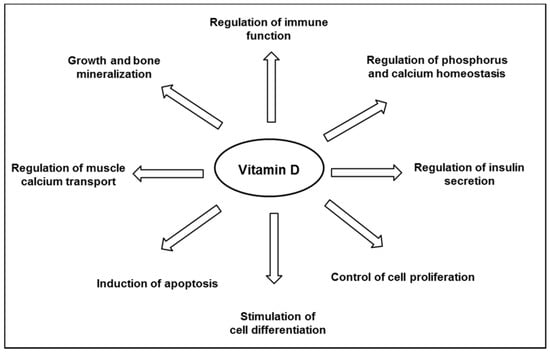 Vitamin D and its functions in the human body []. Vitamin D is required for regulation of immune function, phosphorus and calcium homeostasis, insulin secretion, muscle calcium transport, control of cell proliferation and differentiation, growth and bone mineralization, and apoptosis induction.