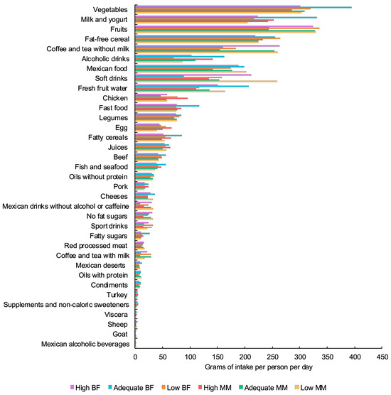 Food group intake by body composition (body fat and muscle mass levels). Note: BF = body fat percentage; MM = muscle mass levels. Detailed descriptive and comparative analyses reporting p values are shown in Supplementary Material S4 (Tables S4.1 and S4.2).