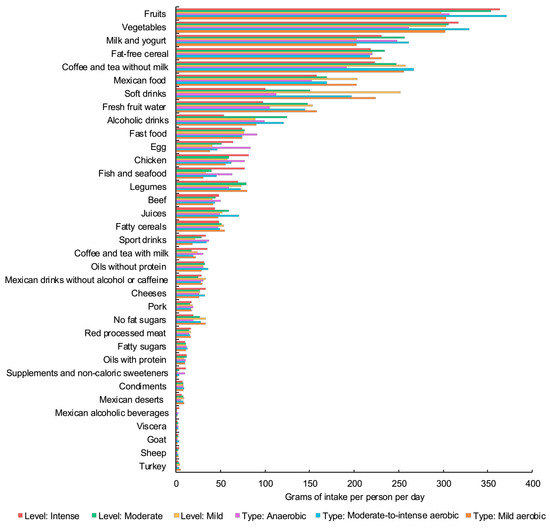 Although not statistically significant, the individuals performing anaerobic exercise also tended to consume more supplements and non-caloric sweeteners, sports drinks, and beef. In contrast, the participants engaging in moderate-to-intense aerobic exercise showed higher intakes of milk and yogurt, cheese, vegetables, fruits, and juices. For those performing mild aerobic exercise, higher intakes of red and processed meats, turkey, legumes, cereals (with and without added fat), Mexican foods, desserts, and soft drinks were observed compared to the other groups. Detailed data for these results are provided in Supplementary Material S5 (Table S5.1).