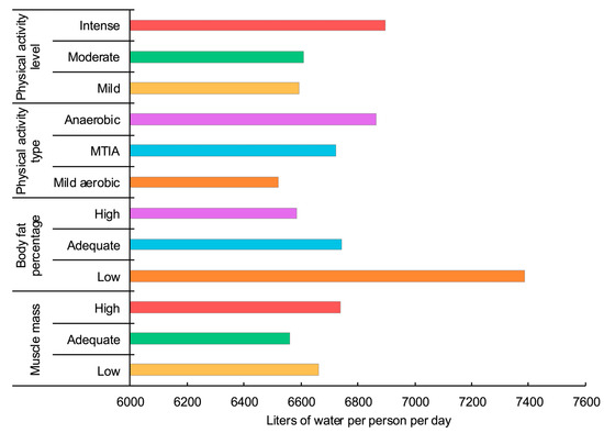 Total dietary water footprint of the sample according to muscle mass levels, body fat levels, physical activity levels, and type. MTIA = moderate-to-intense aerobic. Detailed descriptive and comparative analyses reporting p values are shown in Supplementary Material S6 (Table S6.1).