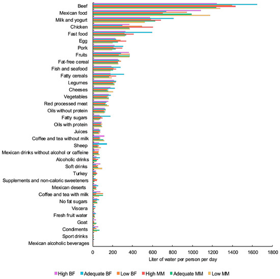 Additionally, the low-muscle-mass group showed a higher WF derived from Mexican food and soft drinks, with values of 1174.93 ± 1039.88 L/p/d and 92.85 ± 143.50 L/p/d, respectively. In contrast, the high-muscle-mass group had a lower WF from Mexican food (699.58 ± 758.53 L/p/d) and soft drinks (48.06 ± 53.64 L/p/d).