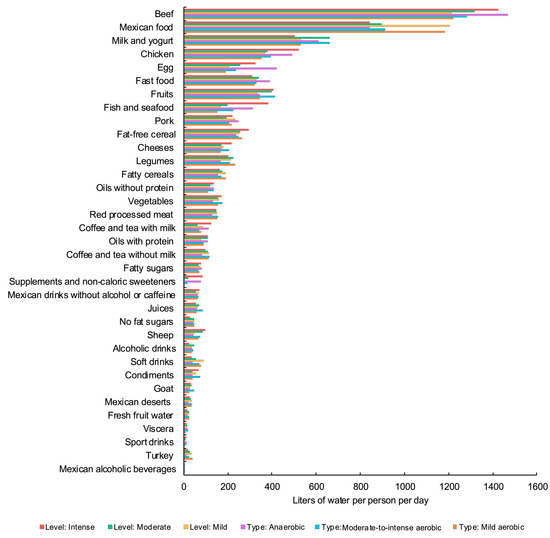 On the other hand, the group performing moderate-to-intense aerobic exercise had a higher WF associated with the intake of non-protein fats compared to the other two physical activity groups (p < 0.05). Additionally, the group performing mild aerobic exercise showed a significantly higher WF for Mexican food and fresh fruit water, with values of 1180.81 ± 1108.64 L/p/d and 25.28 ± 44.07 L/p/d, respectively (p < 0.05).