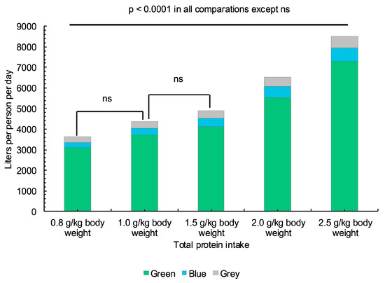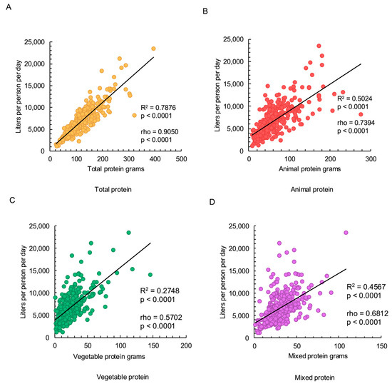A logistic regression reporting odds ratios (ORs) was performed based on the protein intake to evaluate the water expenditure risk (i.e., increases in WF as protein intake rises). For this analysis, the sample was categorized according to their protein intake regarding the grams consumed per kilogram of corporal weight. The cutoff points were 0.8 g/kg, 1 g/kg, 1.5 g/kg, 2 g/kg, and ≥2.5 g/kg, which are the principal protein recommendations in nutrition [19]. The dependent variable was the total WF of food intake, considering the median value 6161.79 L per person per day (L/p/d) as the cutoff point. Also, the protein type (animal, vegetable, and mixed) was analyzed regarding its WF, and a logistic regression reporting odds ratios was also performed regarding the animal/vegetable protein intake ratio. Additionally, linear regressions and Spearman correlations between the protein intake and WF were performed. All analyses were conducted using STATA v12.