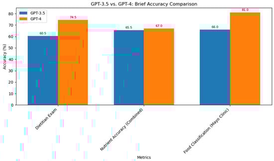 Comparative studies showed that GPT-4 outperformed GPT-3.5 in nutrient accuracy and meal variety [36]. While ChatGPT models often received positive ratings from professionals and, in some cases, outperformed human dietitians [25,28,30], incomplete or discordant dietary suggestions were occasionally identified. Experts emphasized the need for supervision of AI-generated content to avoid misunderstandings or misuse [25,35]. Figure 2 showed a comparison chart between GPT-4 and GPT-3.5.