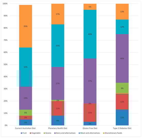 Factors such as urbanisation and eating a Western-style diet are among the highest drivers leading to the instability of current food systems []. A typical Western-style diet contains excessive quantities of dairy, red meat, and discretionary items compared to the recommended healthy eating guidelines [,] and contributes to environmental degradation [,]. Discretionary foods that are high in saturated fat, added sugar, and salt amount to 27% of diet-related GHG emissions in Australia [,].