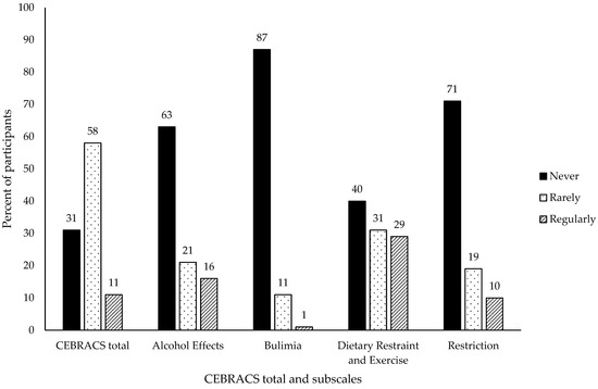 Data were analysed using SPSS (Version 25.0. Armonk, NY, USA: IBM Corp). The CEBRACS measure showed acceptable to excellent internal reliability: CEBRACS total, α = 0.917; alcohol effects, α = 0.966; bulimia, α = 0.750; dietary restraint and exercise, α = 0.868; restriction, α = 0.631. Scores for CEBRACS and its subscales were calculated by summing the responses for the items that make up these measures (see Supplementary Materials). These scores were positively skewed, with a high percentage of respondents choosing “Never” for the FAD behaviours. Therefore, for the purposes of analysis, these highly skewed variables were recoded to create ordinal variables with three categories of “Never”, “Rarely”, and “Regularly”, based on the frequency of performing the relevant behaviours [25]. For example, for the subscale alcohol effects, which has 7 items, the score can range between 7 and 35. This was recoded as Never if the score was 7 (i.e., the equivalent of choosing Never for each item), as Rarely for a score between 8 and 14 (equivalent of choosing Rarely for ≥1 item), and as Regularly for scores ≥ 15 (equivalent of choosing Sometimes, Often or Almost all the time for each item).