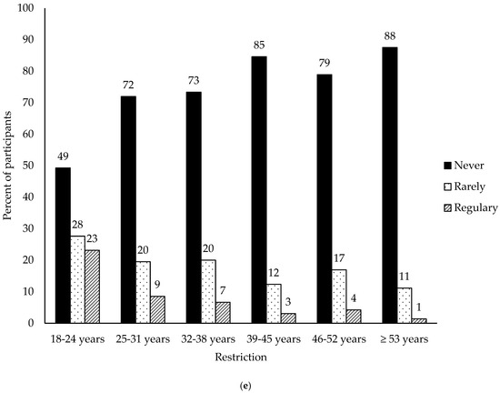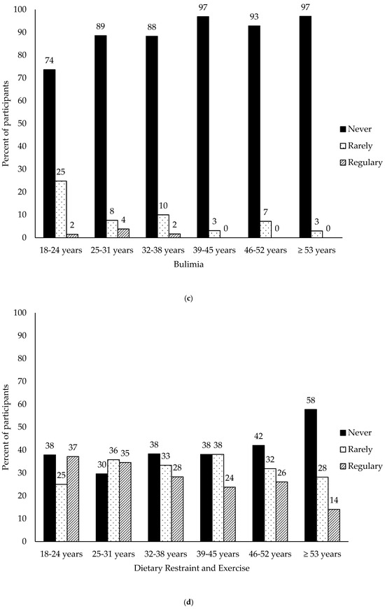 (a) Percentage of participants reporting engaging in FAD behaviours “never”, “rarely” and “regularly” by age group. (b) Percentage of participants reporting engaging in restrictive behaviours to enhance intoxication “never”, “rarely”, and “regularly” (alcohol effects) by age group. (c) Percentage of participants using laxatives, diuretics, and vomiting “never”, “rarely”, and “regularly” (bulimia) by age group. (d) Percentage of participants exercising, consuming low-calorie foods or alcoholic drinks, or eating less (dietary restraint and exercise) “never”, “rarely”, and “regularly” by age group. (e) Percentage of participants missing meals or skipping an entire day (restriction) “never”, “rarely”, and “regularly” by age group.