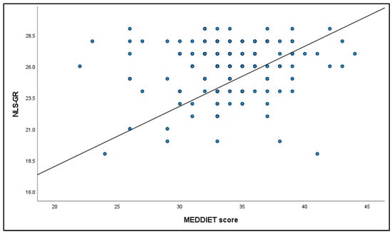 There was no statistically significant correlation between nutrition literacy, calculated using the NLS-GR tool, and adherence to the Mediterranean Diet, assessed with the MedDiet score tool. As illustrated in the corresponding scatter plot (Figure 1), a cloud of points is observed around the straight line, indicating no correlation between them. Furthermore, examining the relationship between MedDiet score and NLS-GR using the Spearman coefficient (Table 4) did not reveal a statistically significant correlation (p-value = 0.202, p > 0.05).