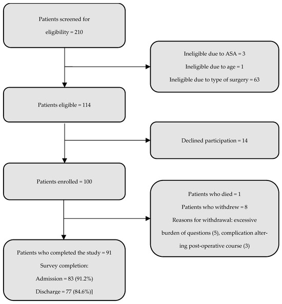 A total of 100 patients were initially enrolled, and 91 completed the study. There was one early postoperative death, and eight patients withdrew. Response rates were high for both admission and discharge surveys (Figure 1). Patients were older, mostly White, mostly omnivorous, and 30.8% were at risk for malnutrition (Table 1). The median length of stay was 8 days, and 15.4% of patients experienced a serious adverse event (Clavien–Dindo grade 3a or higher) (Table 2).
