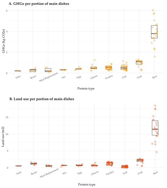 GHG emissions (A) and land use (B) per standard portion of main dishes based on protein source; jittered points represent each dish, while boxes represent quartiles.