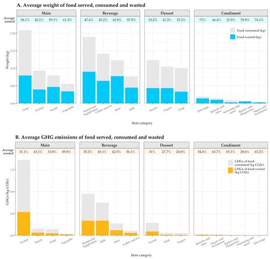 By weight, 49.3% of the total food waste was nutritional supplements, soups, juice, and coffee and tea (Figure 3). The proportion of food wasted was highest for condiments (77%) and beverages (62%) and lowest for desserts (37%). Individually packaged items, such as beverage cups and bottles and condiments, were frequently returned to the kitchen unopened, accounting for 42.3–67% of the food wasted for these items by weight (Appendix A.3).