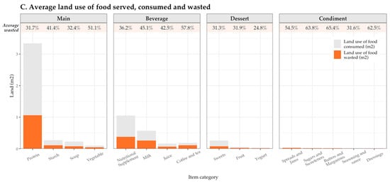 Wasted food represented 44.7% of the GHG emissions of the food served; an average of 1.36 kg CO2e/patient/day (SD = 1.26). Food waste accounted for 2.29 m2 (SD = 2.85) of land use/patient/day, or 43.6% of the land use from food served. Mains and beverages were the largest sources of wasted GHG emissions and land use (Figure 3). Although proteins were consumed more fully than most other items on the tray (38.1% waste by weight, 31.8% waste by GHG emissions), they represented the largest contributor to the total emissions of food waste (37.2%) due to their higher emissions intensity.