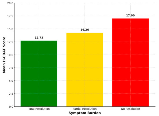Mean H-CDAT scores by symptom burden: total resolution (12.73), partial resolution (14.26), no resolution (17.00). Kruskal–Wallis test: H = 19.55, p < 0.01.