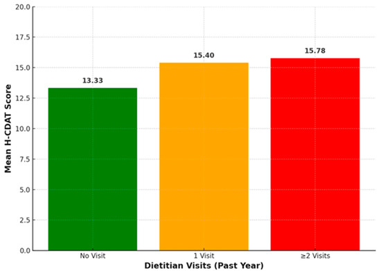 Mean H-CDAT scores by frequency of dietitian visits during the past year: Kruskal–Wallis test: no visit (13.33), one visit (15.40), ≥2 visits (15.78). Kruskal–Wallis test: H = 9.116, p = 0.01.
