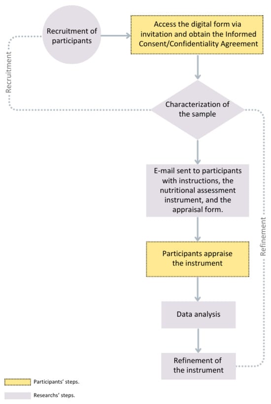 In addition to these questions, optional open-ended questions solicited recommendations for further refinement of the instrument. To assess the relationship between quality criteria scores and experience with ASD, a two-year cutoff was established to differentiate dietitians with up to two years of experience from those with over two years of experience. Figure 1 shows the flowchart of the instrument’s refinement process.