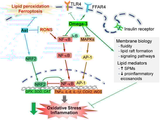 Both Ast and omega-3 PUFAs inhibit oxidative stress and inflammation, the major pathological factors underlying various diseases, including cardiometabolic and neurodegenerative diseases, through complementary mechanisms. Ast is relatively polar compared to other carotenoids and can span the PL monolayers of lipoprotein particles and bilayers of cellular membranes, preventing lipid peroxidation by scavenging free radicals and RONS. Ast also suppresses oxidative stress by stimulating the transcriptional activity of NRF2, thereby increasing expression levels of antioxidant enzymes. Omega-3 PUFAs suppress inflammation through multiple mechanisms. Upon incorporation into membrane PLs, omega-3 PUFAs increase membrane fluidity and lipid raft formation, affecting cellular signaling activities. Additionally, they serve as precursors for the production of anti-inflammatory lipid mediators and reduce the production of proinflammatory eicosanoids by competing with omega-6 ARA for the same enzymes. Omega-3 PUFAs also suppress inflammation by antagonizing the proinflammatory TLR4 signaling pathways and by acting as ligands for FFAR4. Through these various mechanisms, omega-3 PUFAs suppress the canonical proinflammatory NF-κB and MAPK signaling pathways. An antagonistic crosstalk exists between NRF2 and NF-κB, the two primary transcription factors that mediate antioxidant responses and proinflammatory responses, respectively. Therefore, Ast activation of NRF2 can suppress inflammation while omega-3 PUFA inhibition of NF-κB can enhance antioxidant capacity, clearly indicating complementary actions of the two bioactive food components.