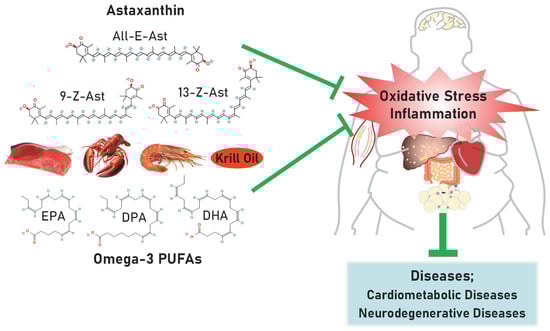 The complementary actions of Ast and omega-3 PUFAs to counteract oxidative stress and inflammatory responses suggest that combined intake of both nutrients may be better than each (Figure 3). Accordingly, several studies have shown that combinations of Ast and DHA exhibit better protective effects than each in animal models of neurodegenerative diseases [90,91]. Moreover, Ast and DHA exhibited potential synergistic beneficial effects on dysregulated plasma metabolic profiles induced by undernutrition during the gestation and lactation periods [92]. Krill oil contains both Ast and omega-3 PUFAs. However, krill oil contains omega-3 PUFAs in PL forms compared to the TAG forms in fish oil, and it also contains variable amounts of EPA and DHA per serving [93]. Whether supplementation of krill oil is better than fish oil in reducing disease risks remains undetermined.