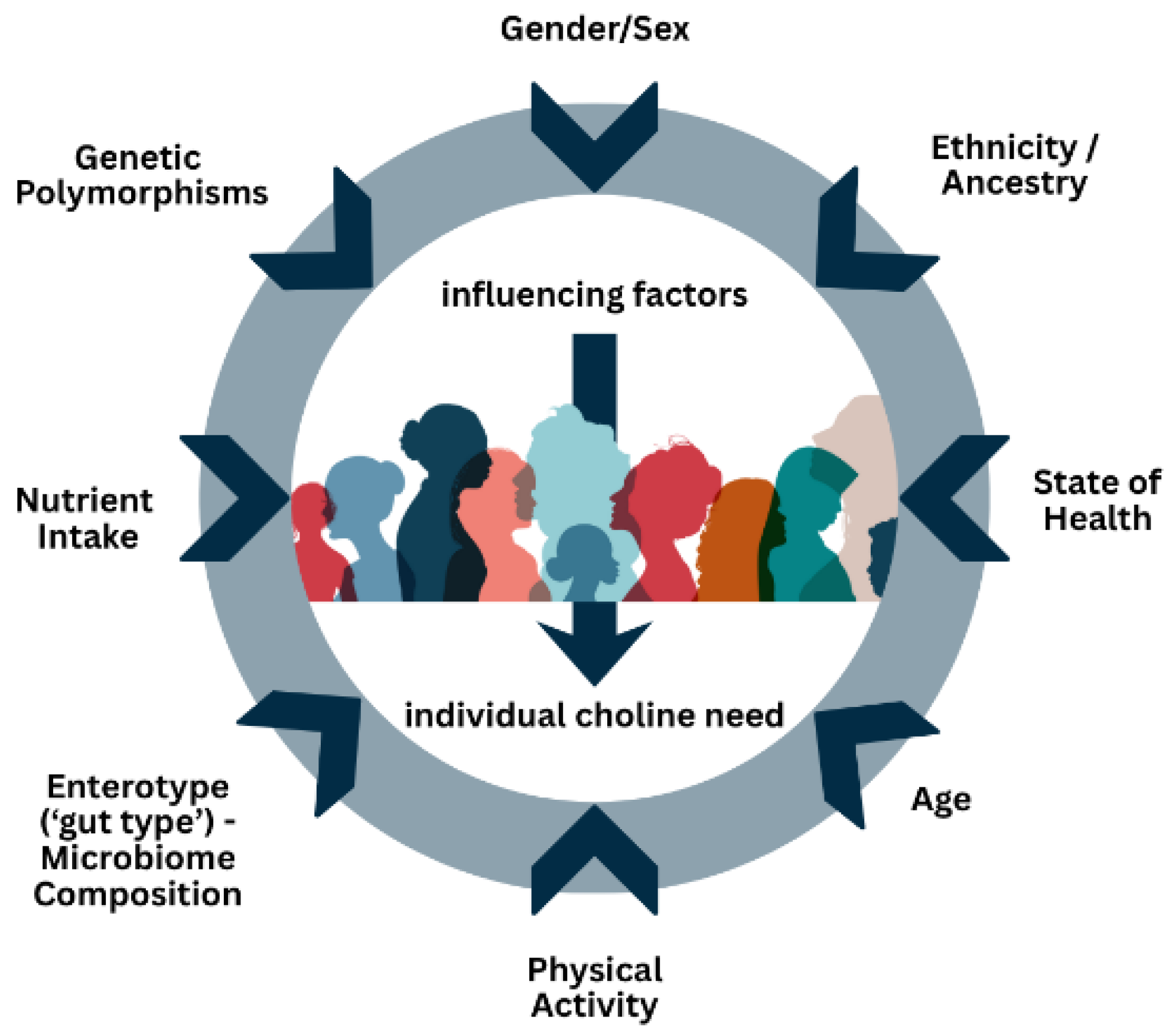 Figure 1 illustrates the most important factors influencing human choline requirements, which cause choline nutritional requirements to vary from person to person.