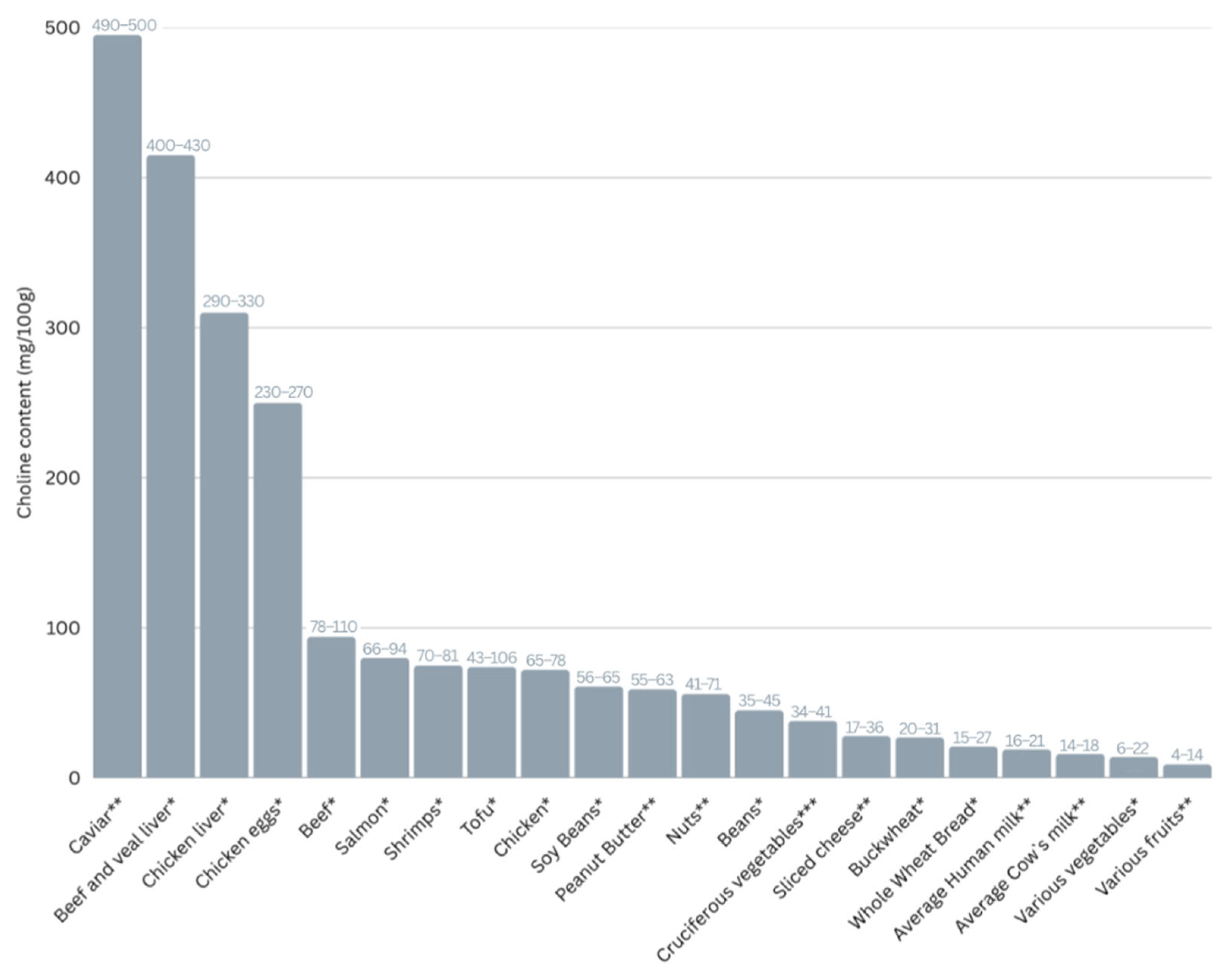 Figure 2 illustrates, caviar and liver (other organs have not yet been sufficiently studied for their choline content) are by far the most choline-rich foods in the human diet. However, since neither of these foods is a regular part of the European diet, chicken eggs are by far the most important source of choline.