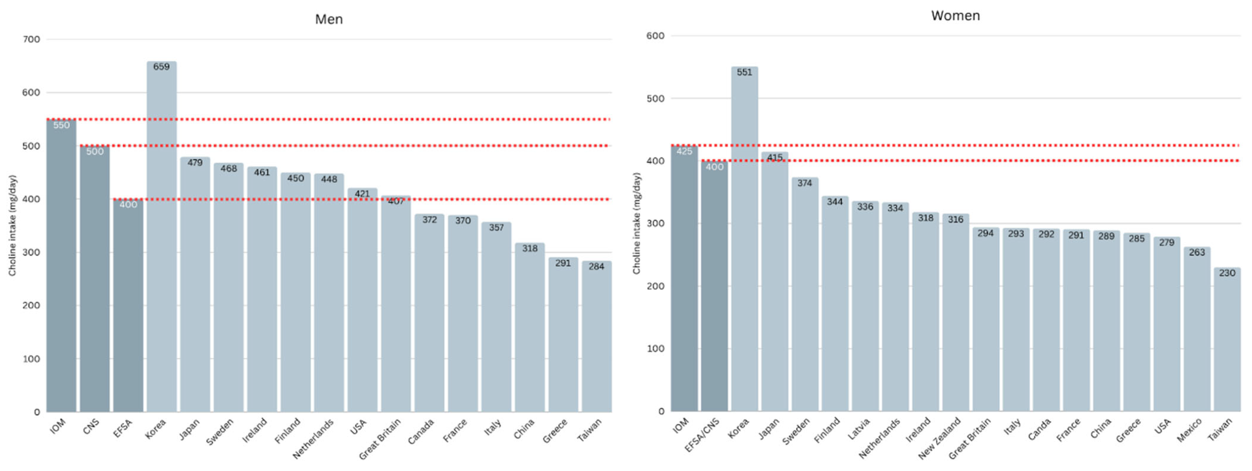 Figure 3 illustrates the average choline intake of men and women in different countries on an omnivorous diet in relation to the choline recommendations of the IOM, the CNS, and the EFSA, and highlights why better education on the subject of choline would be so important.