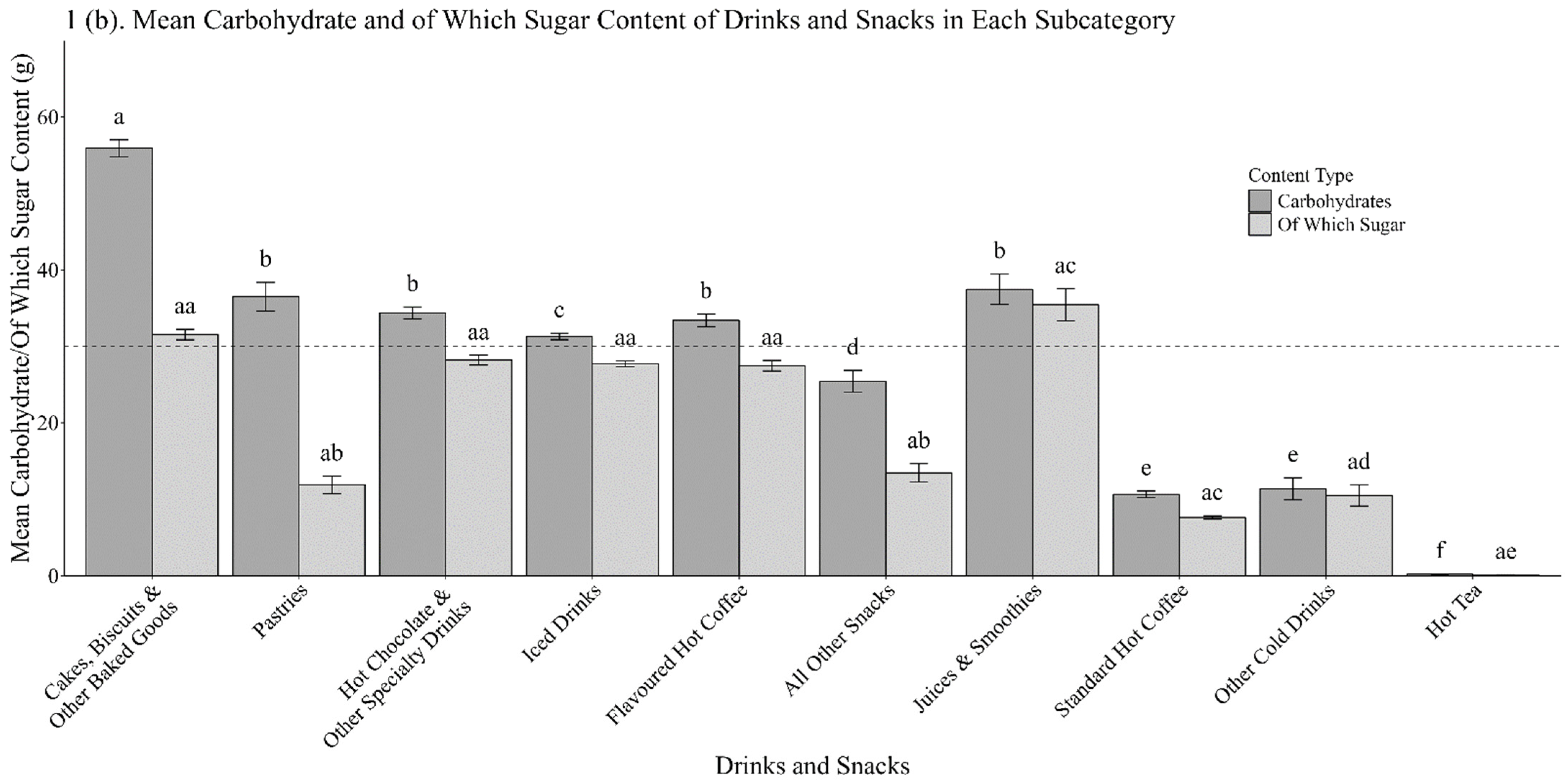 The aim of this observational study is to evaluate the energy and sugar content of drinks and snacks available at the largest coffee shop and café chains currently operating in the UK. The impact of different brand and alternative milks on the nutritional content will also be assessed. The data will be compared to dietary recommendations and nutritional requirements currently provided to the population by the NHS and Public Health England.