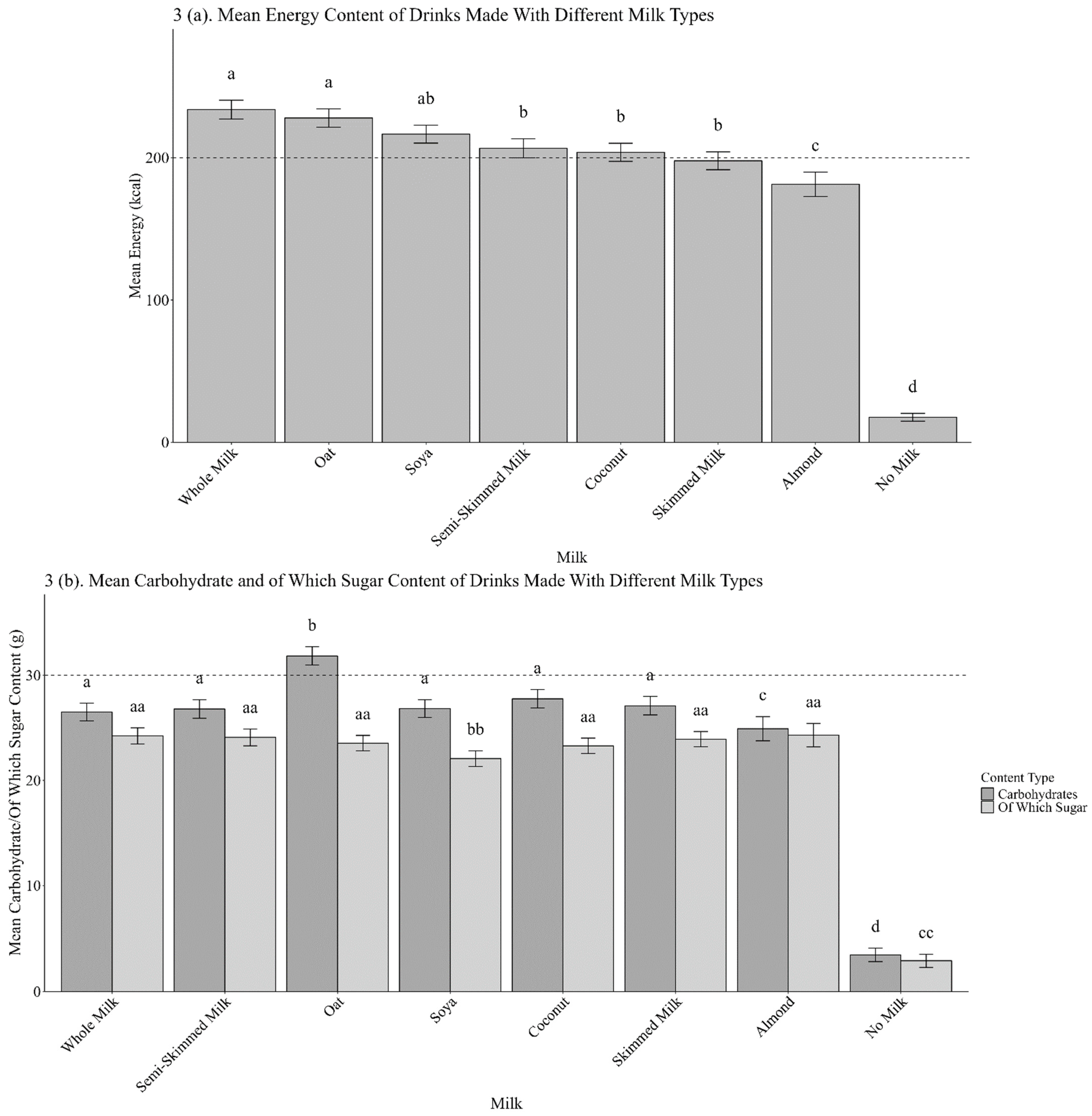 19]. Yet our results suggest that drinks made with dairy-alternative milks are not necessarily lower in energy or sugar than their dairy-containing counterparts. It was found that drinks made with almond milk are the only option that contain less energy than either the dairy, or other dairy alternative, choices included in this study. Consequently, switching to almond milk-based drinks could make a good option for an individual looking to reduce their energy intake. However, it is to be noted that there were only three coffee shop chains that offered drinks made with almond milk.