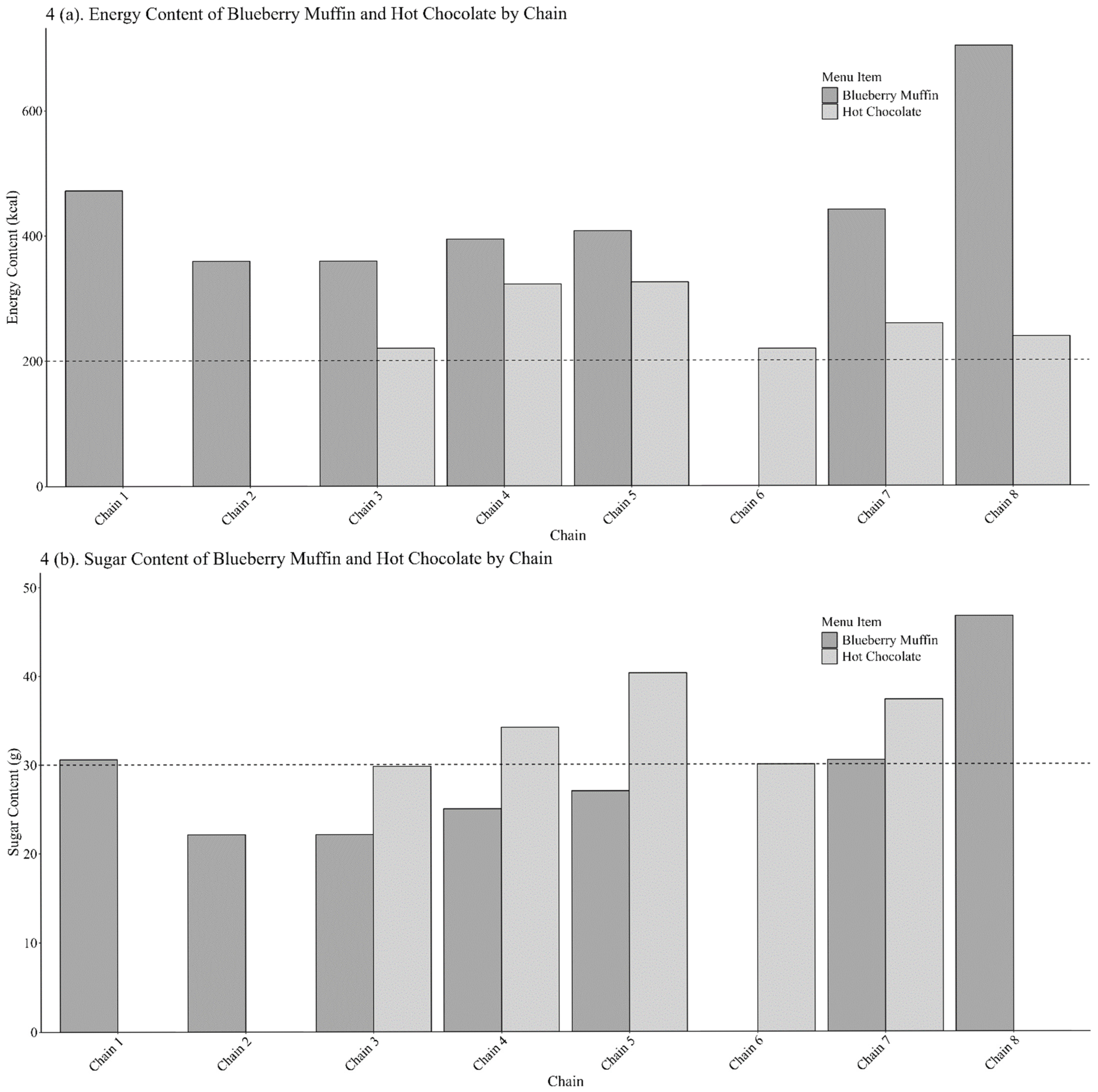 29]. It is also more than the NHS recommended intake of free sugar for a full day of eating. While it is likely that hot chocolates are generally understood to be ‘unhealthy’, a blueberry muffin may be perceived as a ‘healthy’ option to choose in comparison to other available snack items. However, the data shows that in every coffee shop chain the energy content of the blueberry muffin exceeded that of the hot chocolate. Improving food labelling and consumer education may help to improve individual’s dietary choices, benefiting wider public health in the UK.