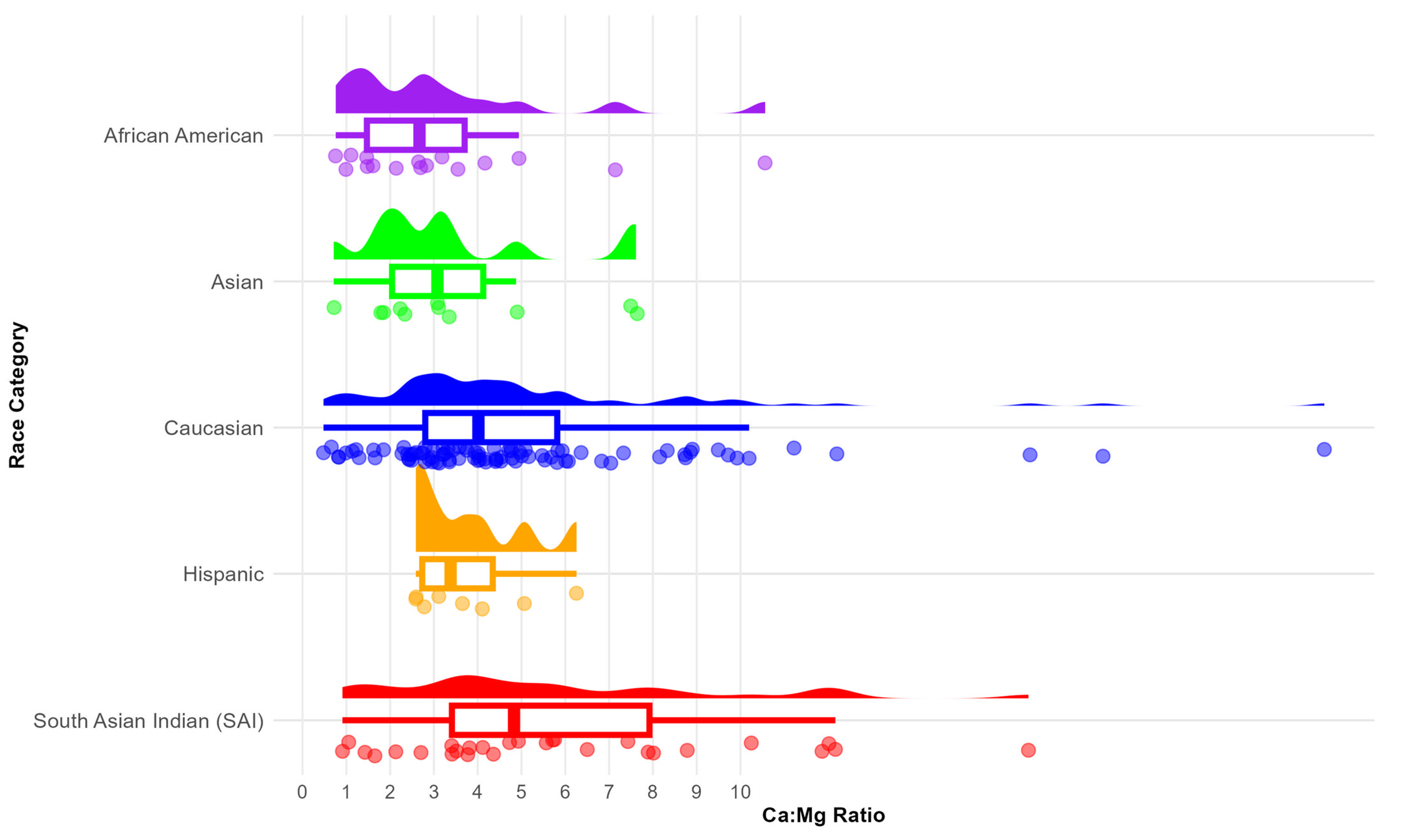 Figure 1 are raincloud plots illustrating the distribution of the dietary calcium-to-magnesium (Ca:Mg) ratios across different racial categories (African American, Asian, Caucasian, Hispanic, and Other). Each plot combines a half-violin plot, a box plot, and individual data points, providing a comprehensive visualization of central tendency, spread, and density within each group.