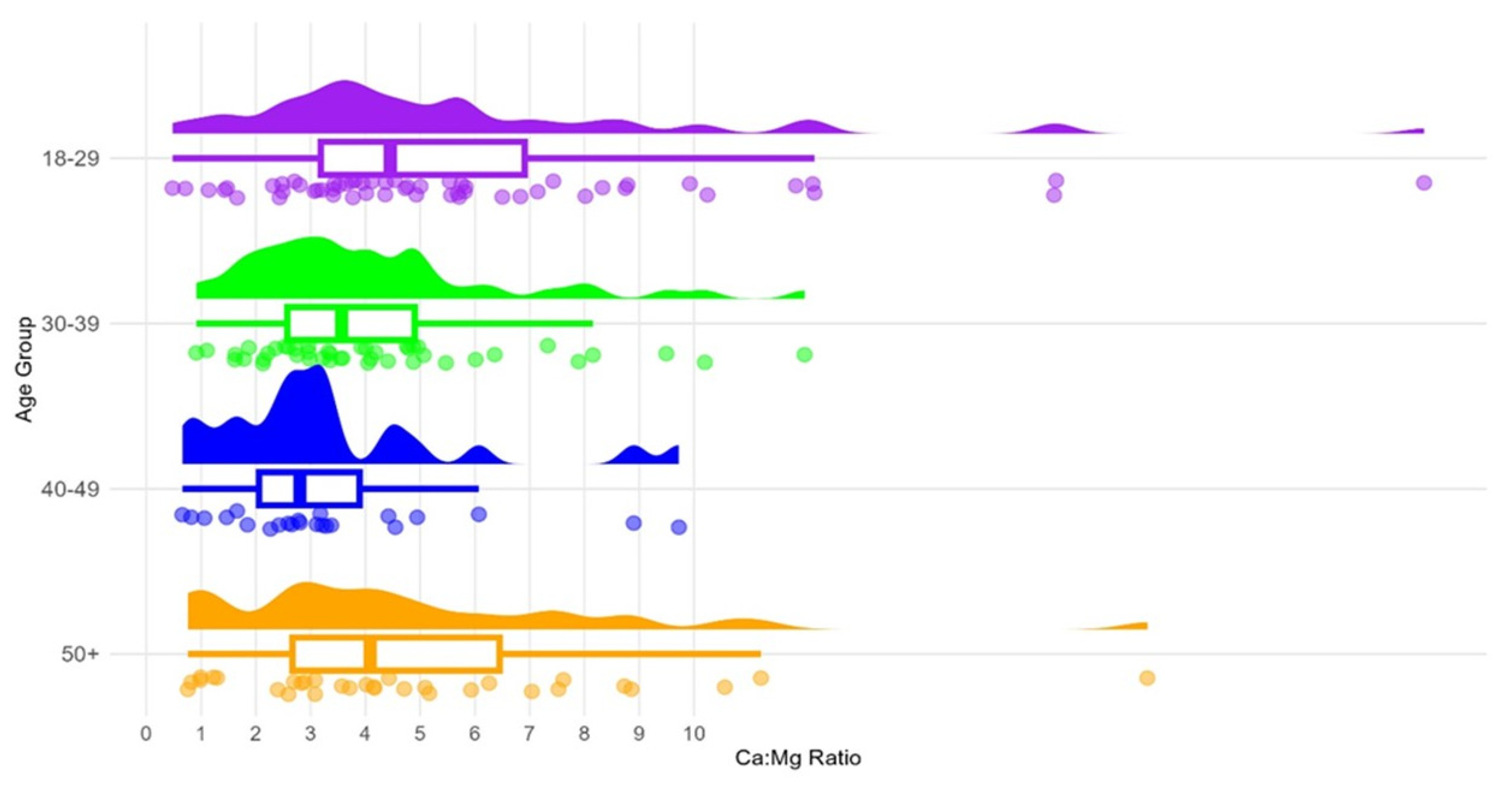 Figure 2 shows horizontal raincloud plots of the dietary calcium-to-magnesium (Ca:Mg) ratio stratified by age group (18–29, 30–39, 40–49, 50+). Each group’s distribution is visualized using a density plot (top), a boxplot (middle), and raw data points (bottom), providing insight into both distributional shape and individual variation.