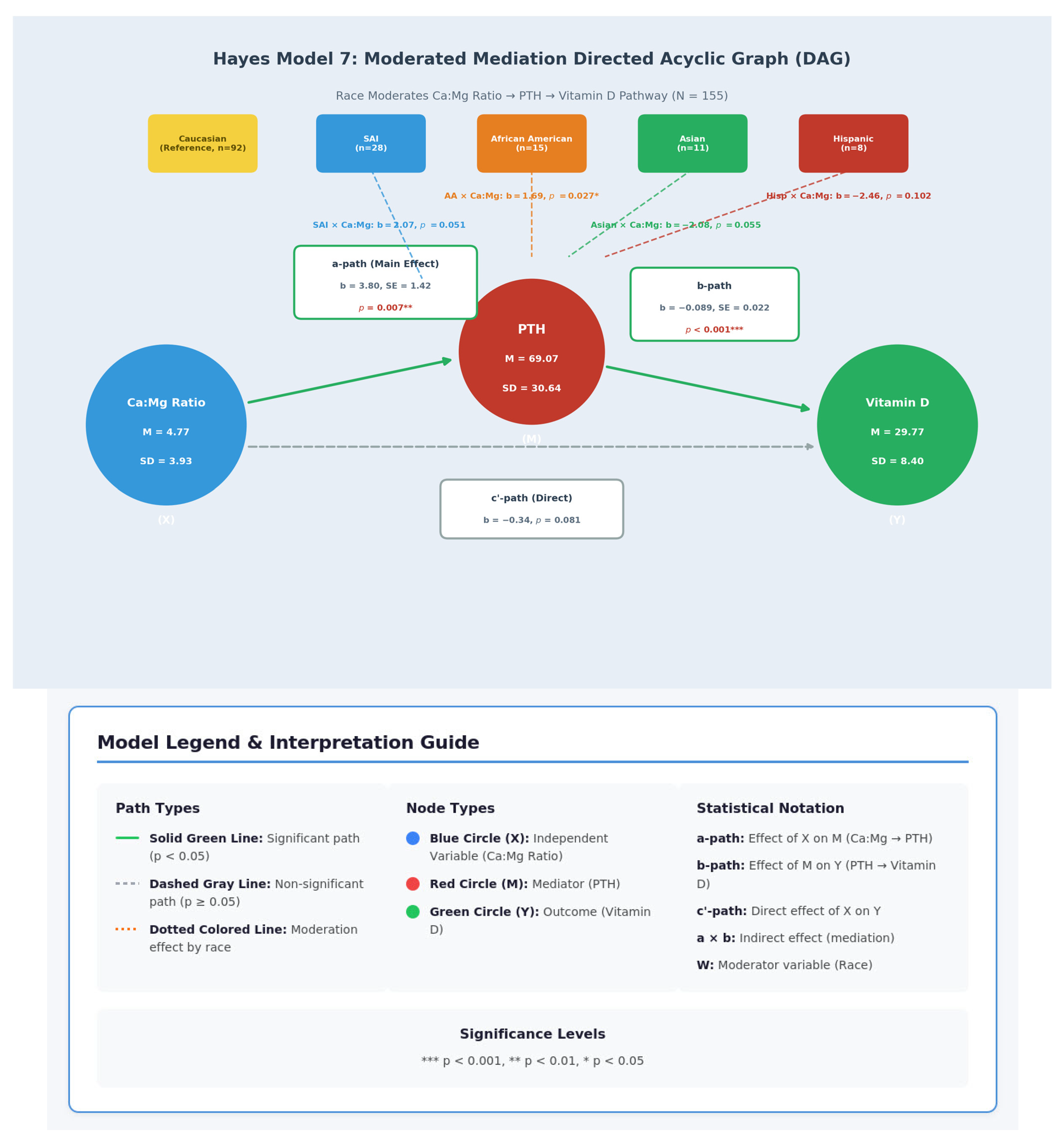 In the moderated mediation model, the dietary Ca:Mg ratio, age, and race were specified as the independent variable (X), continuous moderator (W), and categorical moderator (Z), respectively; PTH was specified as the mediator (M), and vitamin D level was the outcome variable (Y). Continuous variables were mean-centered to enhance the interpretability of interaction terms. Model 7 tested whether the indirect effect of dietary Ca:Mg on vitamin D via PTH (a × b) was moderated by age and race. Conditional indirect effects were estimated using 5000 bootstrap samples to compute bias-corrected confidence intervals. Interaction terms (the dietary Ca:Mg × Age and the dietary Ca:Mg × Race) were included to test the moderation of both mediated and direct effects. This approach allowed for testing whether, and under what conditions, the mediation pathway was operative. Data visualizations for the moderated mediation were created with assistance from Claude AI (Anthropic) for figure design and layout optimization.