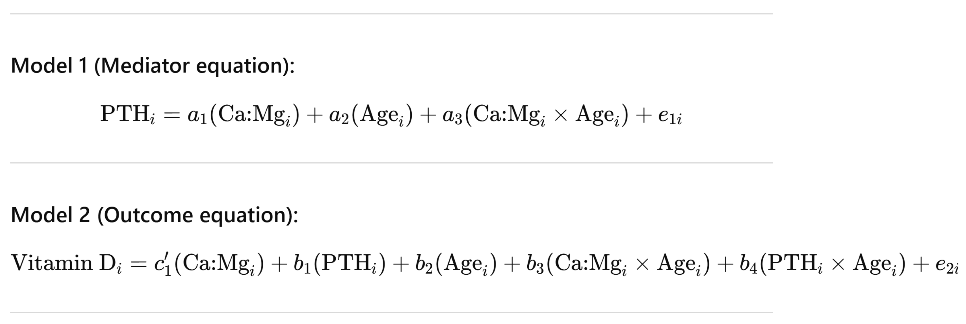 In Model 1, PTH was regressed on the dietary Ca:Mg, Age, and their interaction term (Ca:Mg × Age), testing for the moderation of the indirect effect’s first stage.