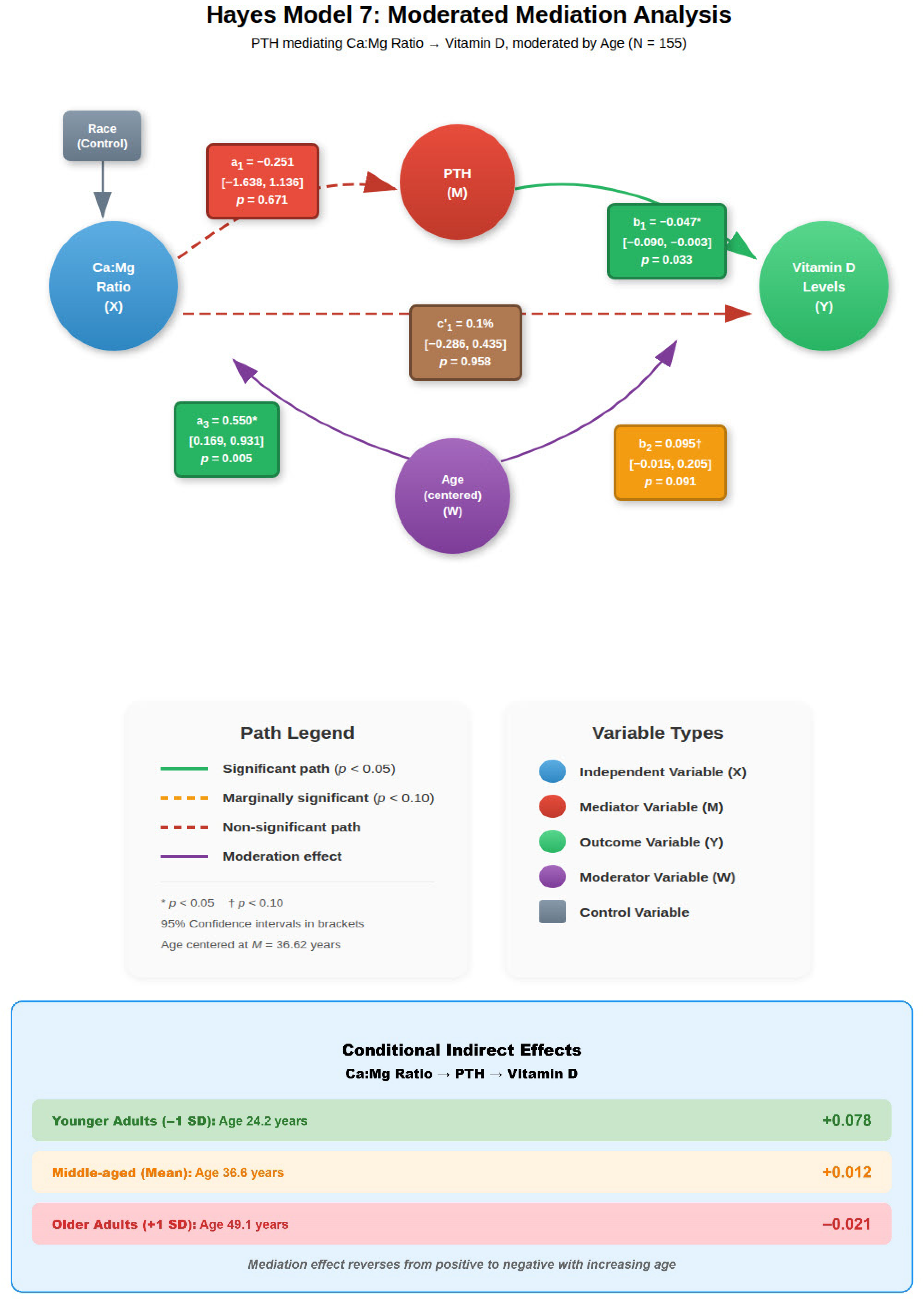 This model allows for both the direct effect of the dietary Ca:Mg on Vitamin D and the indirect effect via PTH to vary as a function of Age, constituting a second-stage moderated mediation model.