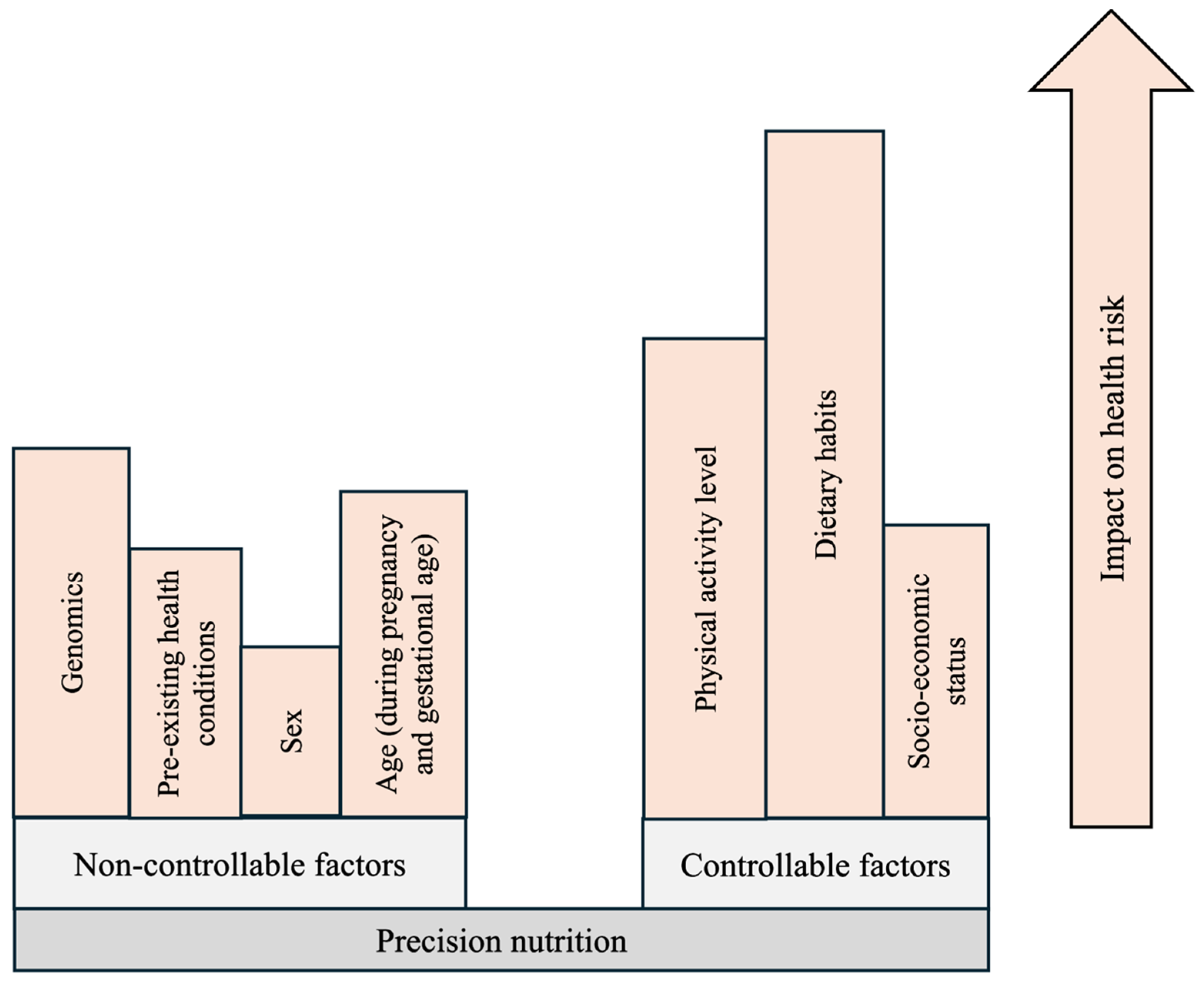 - Alabduljabbar, S.; Zaidan, S.A.; Lakshmanan, A.P.; Terranegra, A. Personalized Nutrition Approach in Pregnancy and Early Life to Tackle Childhood and Adult Non-Communicable Diseases. Life 2021, 11, 467. [Google Scholar] [CrossRef]