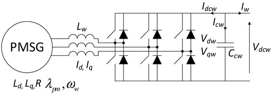In this section, a model of a wind farm scenario based on wind turbines equipped with a permanent magnet synchronous generator (PMSG) is considered. The PMSG is mechanically connected to a wind turbine and is electrically connected to a transmission line. The other end of the transmission line is connected to an AC-to-DC converter. The output of the AC-to-DC converter is connected to the DC grid. The corresponding configuration is shown in Figure 1.