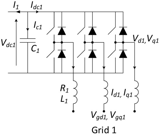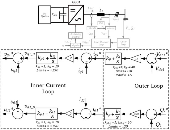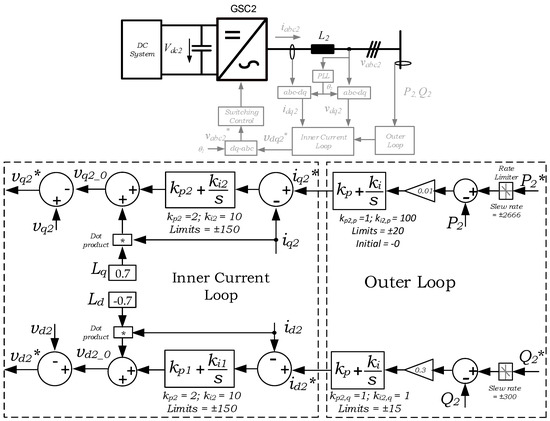 The setup shown in Figure 3 is exactly the same as in Section 2.2, except that the DC link voltage control in the outer loop is replaced with the active power flow control. Therefore, all derivations up to the inner current control are the same except for the use of subscript 2 in place of subscript 1. However, the outer most control loop consists of active power flow control.