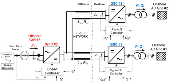 These were in the same order as those derived in the Section 2. Figure 4 shows the overall hardware system block diagram, which corresponds to the MTDC network. Different configurations such as GSC1 only, GSC1 connected to GSC2, GSC1 connected to WFC, and GSC1 connected to GSC2 and WFC were used to highlight the respective controller implementations in the model verification process.