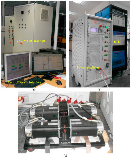 Hardware-in-the-loop experimental platform: (a) VSC-MTDC test rig and dSPACETM graphical user interface; (b) power amplifier (left) interfacing the MTDC test rig and the RTDS (right); (c) 10 kW PMSGs in the WFG.