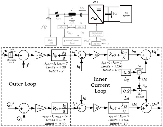 Figure 8 shows the wind farm frequency and reactive power controller of the wind farm converter. The frequency is controlled using the q-axis and the reactive power is controller using the d-axis. The reference value of offshore frequency, f *, is compared with the actual frequency, f, of the synchronous generator. The error between the two signals is fed to a proportional gain, whose output is processed using a PI controller. The output of the PI controller is the reference q-axis current, iq*.