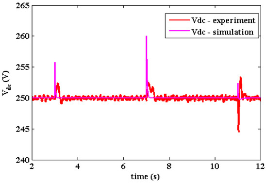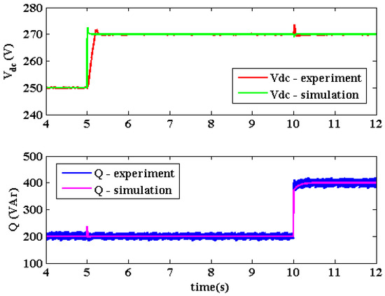 It can be observed that the Vdc1 follows the reference Vdc1* in principle, although the experimental transient results are slower than the simulation model results in the step change, which may be attributed to possible parameter mismatches in the controller implementations. However, this trend is not prominent in the Q1 response, which follows the reference well. In addition, the dq cross-coupling is present to different degrees in the two cases. In the Vdc1 control, cross-coupling in the simulation is lower than the experimental corresponding to the step change in Q1*. In the Q1 control, however, the cross-coupling in the simulation is larger than in the experiment.