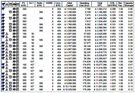 A viable network is a hybrid model that satisfies the demand requirements. The program filters out all infeasible systems and displays the results in increasing NPC order.