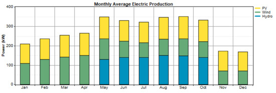 In Figure 10 for solar power generation, the irradiance of the surface is 1000w/m2 and the average solar radiation in the least sunny month is 5.19kWh/m2/day for the case study areas, and the illuminance is 683,060.11 lux or 683,060 lm/m2. In Figure 11 for wind power generation, the average wind speed in the least windy season at a 10 m tower height is 3.6 m/s and at 50 m tower height is 4.44 m/s, which is sufficient to produce power as the minimum wind speed required to start to produce power is 3.5 m/s. Finally, in Figure 12, the flow rate of micro-hydro power is 1.6 m3/s. The simulation result of the designed standalone system is presented in the following figures.